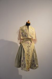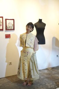 Saat menulis artikel ini, saya kembali membuka foto-foto karya “Benih Temurun” yang saya ambil saat pameran. Semakin dilihat, karya ini semakin menarik. Bagian dada cape dihiasi embroidery bentuk tangan yang sedang menyentuh gugusan bunga kecil, cantik sekali. Lagi – lagi, terbayang gambaran ini seperti pelepasan benih – benih yang akhirnya menjalar ke bawah.