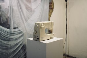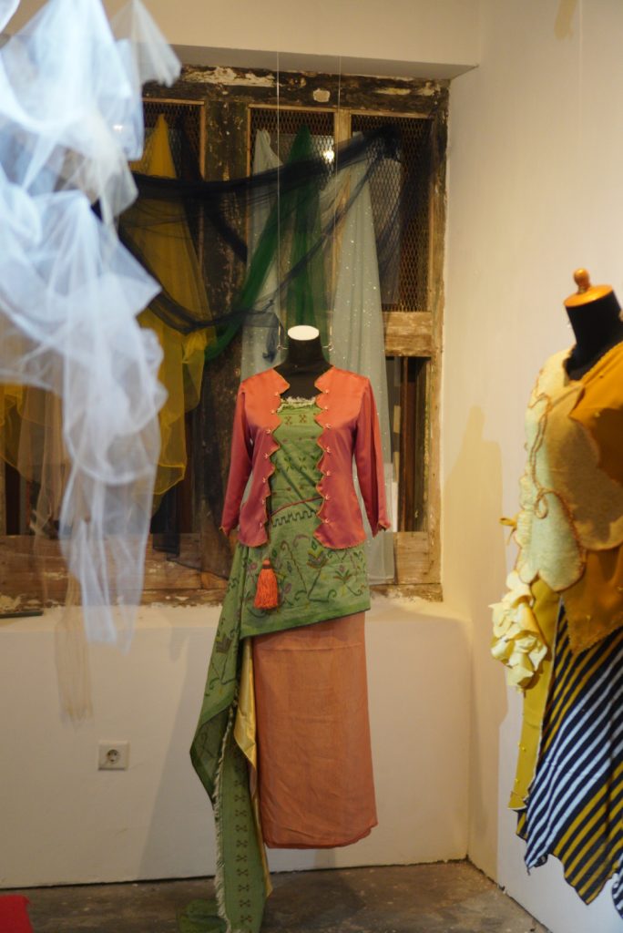 Praduga saya terjawab di sesi artist talk pada malam harinya. Untungnya, tak perlu menunggu berhari – hari untuk menjawab rasa penasaran ini. Ternyata, “Benih Temurun” lahir dari inspirasi perempuan yang sedang berada pada fase ovulasi. Tentu, selain mengalaminya sendiri, dengan latar belakang di bidang Biologi, Ria pasti memahami proses ini di luar kepala. Saat fase ovulasi, tubuh perempuan membuka diri pada kemungkinan – kemungkinan baru. Dalam hal itu, tampak jelas bahwa roknya membentuk lengkungan ke bawah, menyerupai arc yang tersusun simetris dan mengingatkan pada bentuk rahim. Di sisi kanan kiri atasan, terdapat lengan dengan bahan tulle yang mengembang menyerupai ovarium dengan saluran tuba falopi sebagai penghubung.